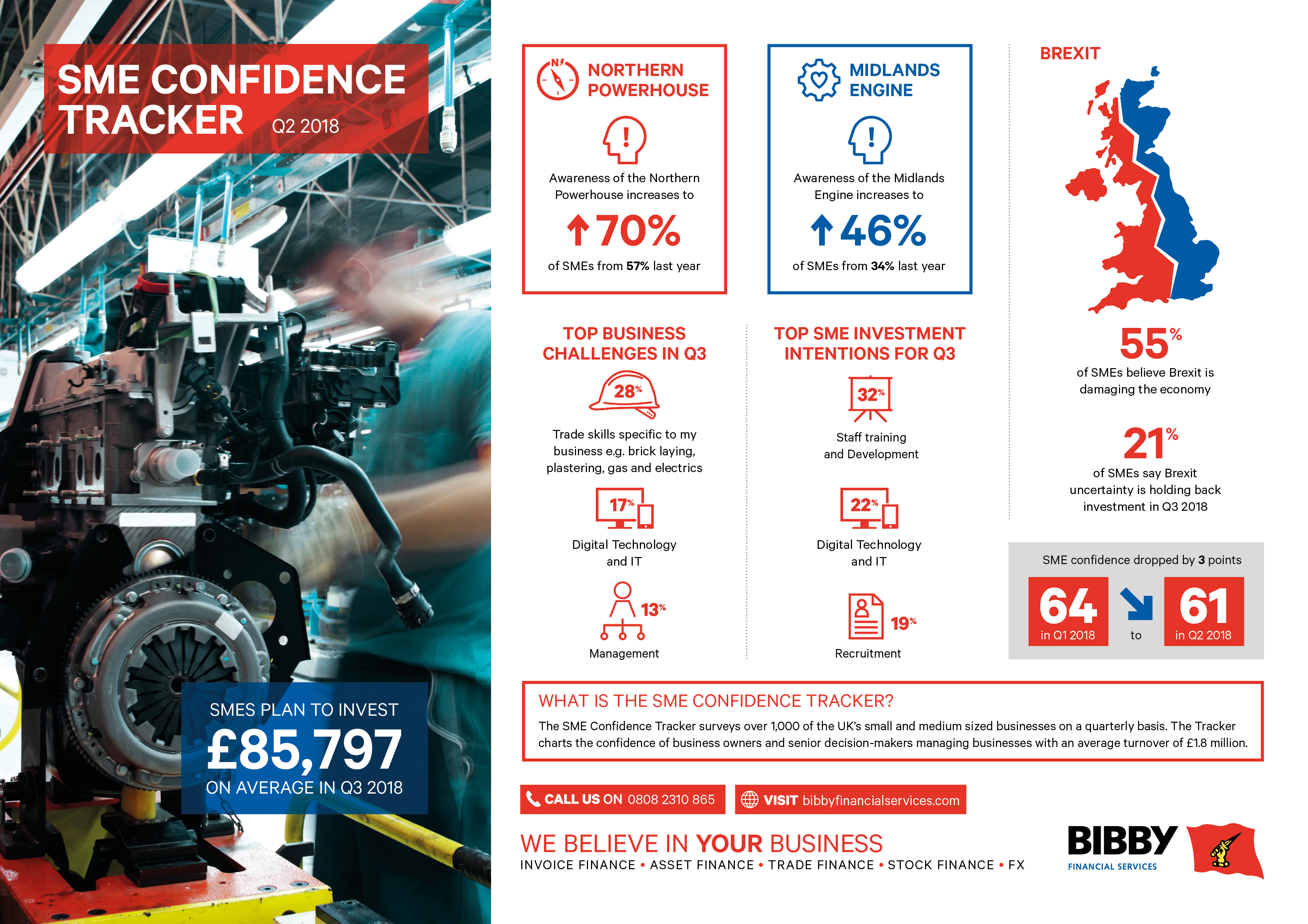 The SME Confidence Tracker for Q2 showed that SMEs feel Brexit is ultimately having a negative impact on wider government policies, in addition to affecting their own investment plans. Over half (55%) believe Brexit is damaging the economy and the Government’s ability to deliver on its industrial strategy of rebalancing the economy. Furthermore, more than two-fifths of businesses say that the uncertain economic environment in the UK (21%) and uncertainty arising from Brexit (21%) are holding back investment.