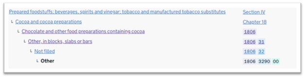 The commodity code for chocolate bars imported into the UK could be 1806329000, she says. This breaks down as follows: