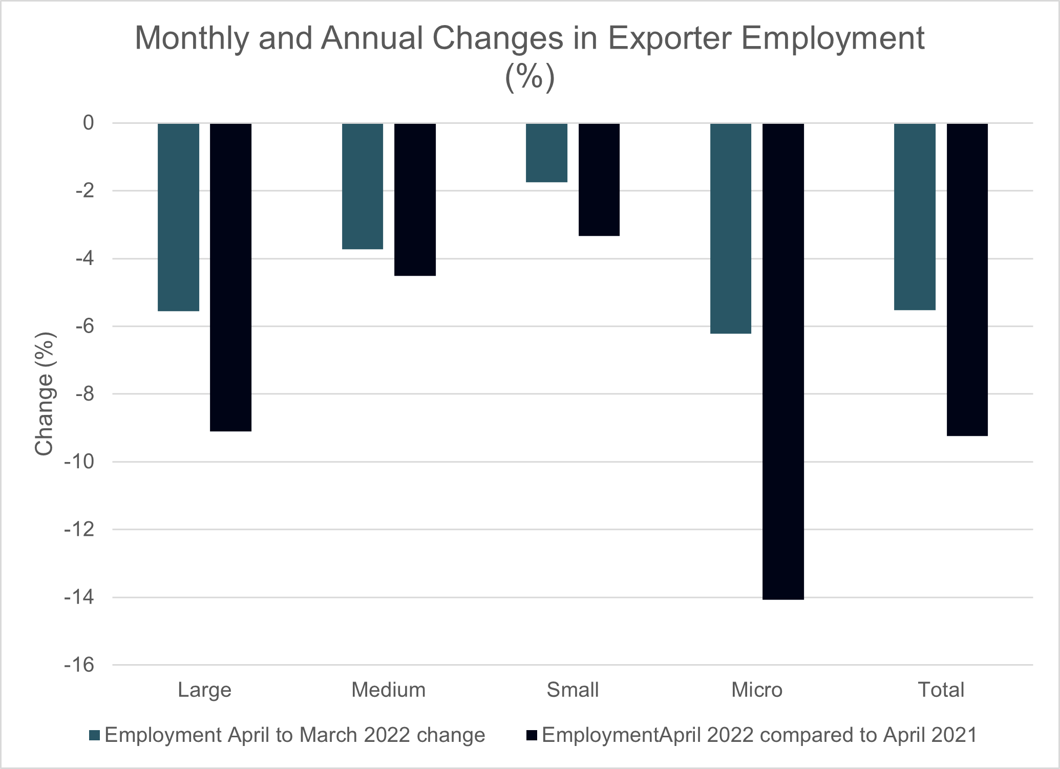 Since March 2022, employment from exporters of all sizes has declined, with large companies at -5.56%, medium companies at -3.73%, small companies at -1.76% and micro companies at -6.22%. This is an overall decline of 5.52%.