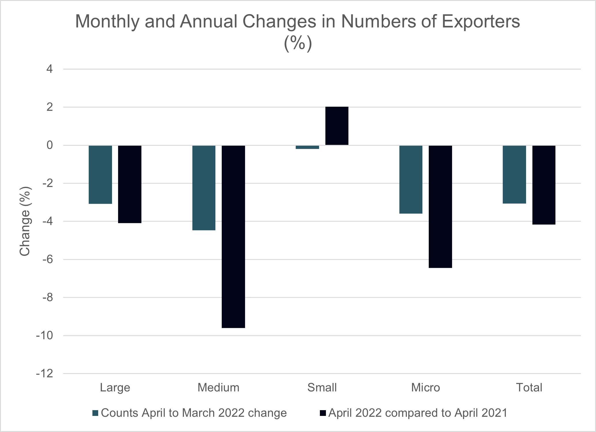 Since March 2022, the overall numbers of large, medium, small and micro exporters has declined by 3.07%, 4.48%, 0.20% and 3.59% respectively. That equates to an overall decline in the numbers of companies exporting of 3.06%.