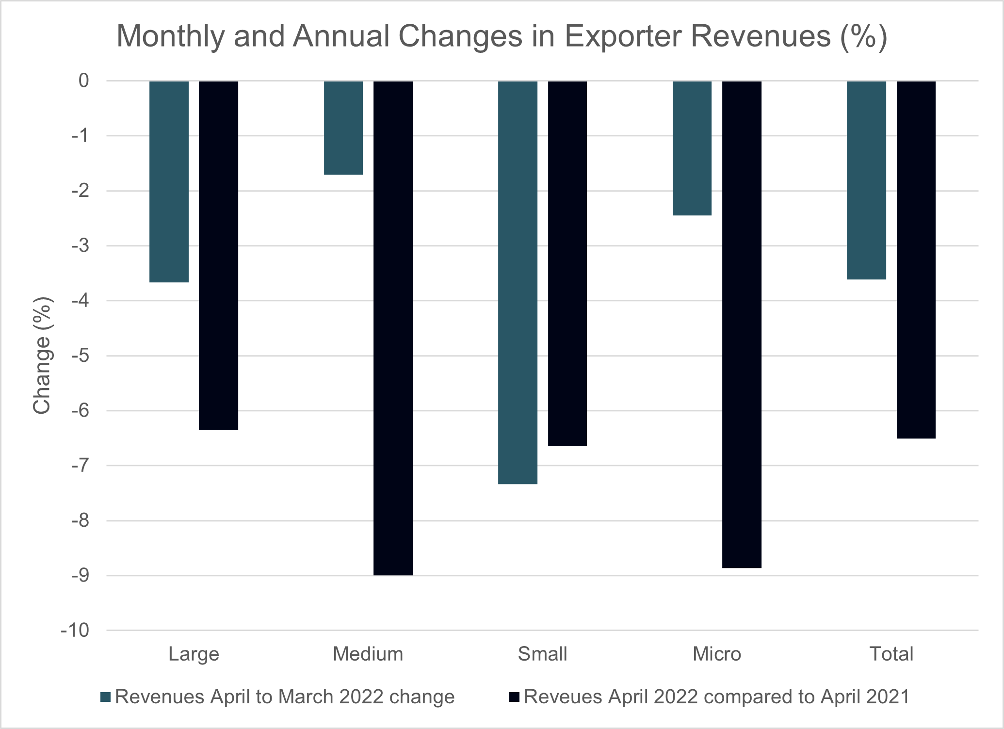 April 2022 revenues against April 2021 revenues have also all declined, yet more markedly - at -6.34% for large, -8.99% for medium, -6.64% for small and -8.87% for micro companies. That equates to an aggregate drop in revenues of 6.51%.
