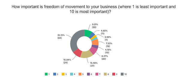 With freedom of movement also being something that the businesses polled valued - 69.04% scored continued freedom of movement as having 7 or more out of 10 in importance with 35.15% saying 10 - there was generally a feeling of helplessness about where the negotiations are currently going, with 81.51% saying they didn’t have sufficient routes to government to voice their concerns and views about Brexit.