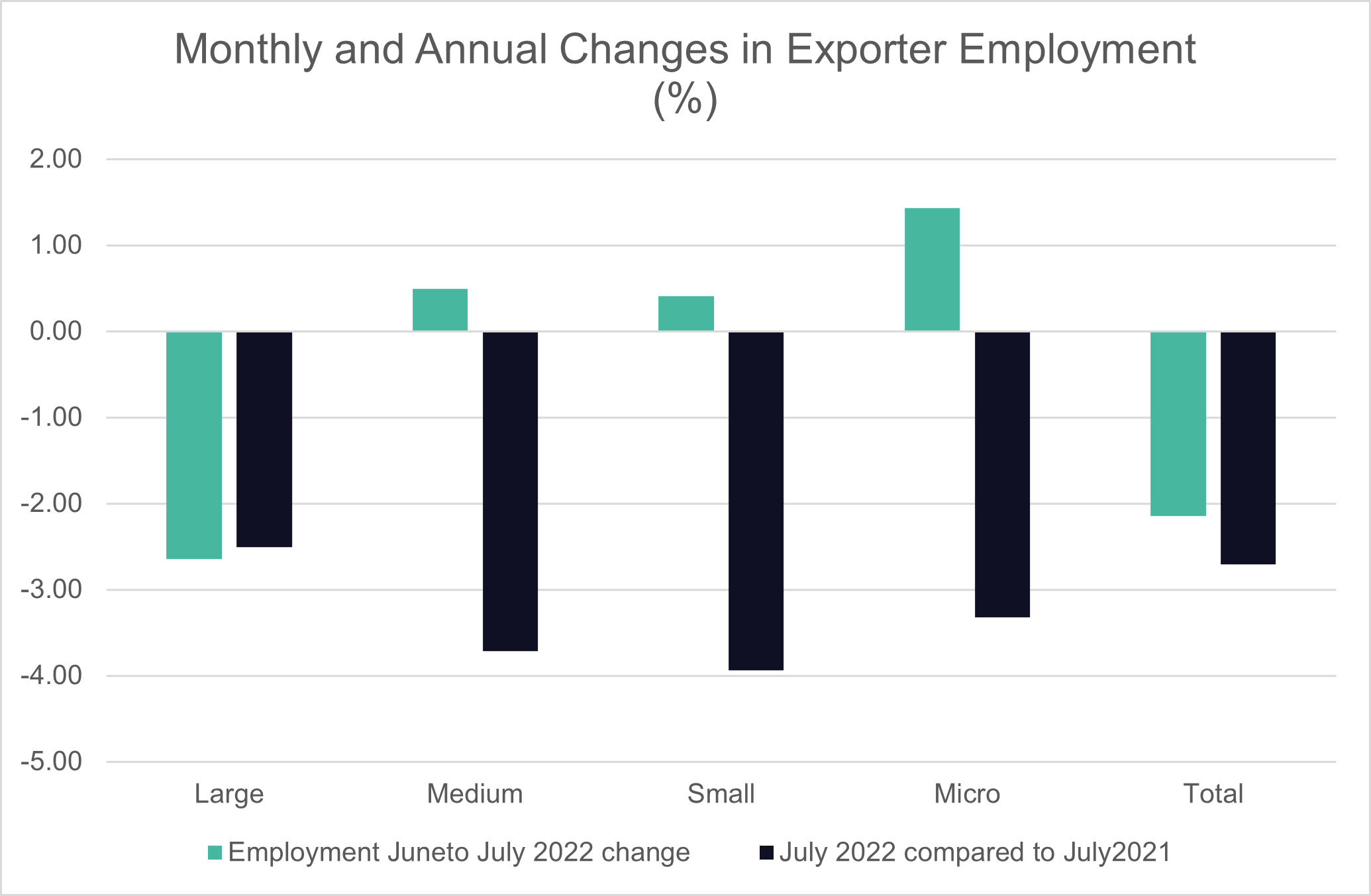 In comparison to July 2021, all sized companies are hiring fewer exporter staff, with micro, small, medium, and large companies experiencing a drop of 3.3%, 3.9%, 3.7%, and 2.5% respectively.
